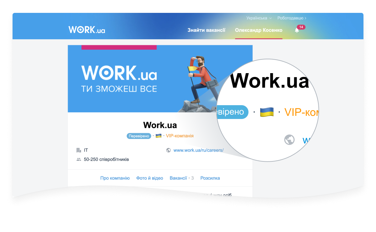 Закликаємо всі українські компанії змінити мову опису і вакансій на українську. Після того як ви зробите переклад, у вашому профілі з’явиться патріотичний бейдж — прапор України, як на сайті Work.ua, так і в мобільному застосунку.