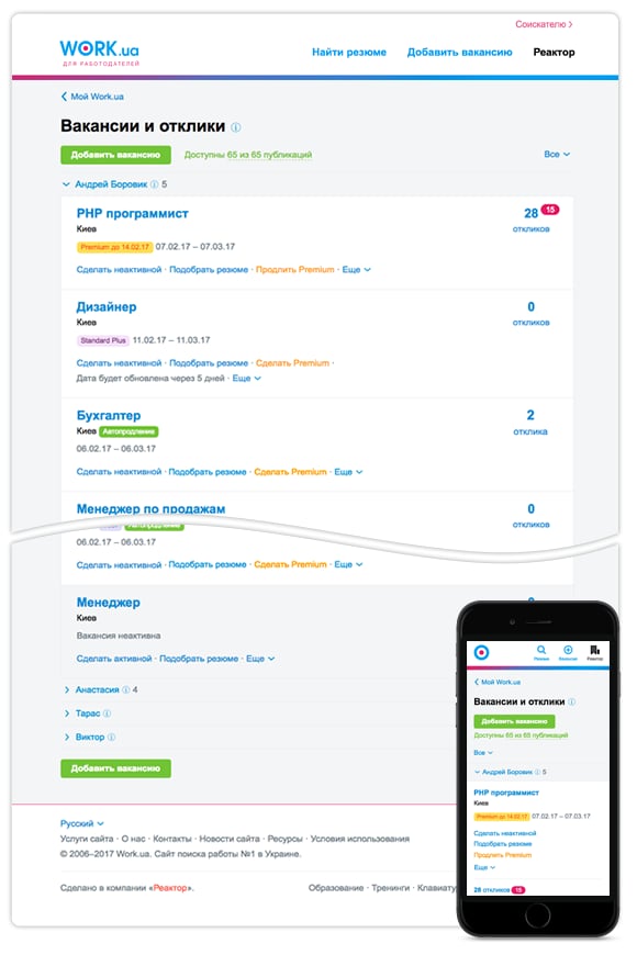 Мы знаем, что работодатели предпочитают работать с нашим сайтом с настольных компьютеров. В том числе и потому, что у нас просто-напросто не было мобильной версии! Теперь такая версия есть. Все ваши вакансии и отклики доступны вам в любое время и в любом месте — а это очень удобно, мы проверяли.