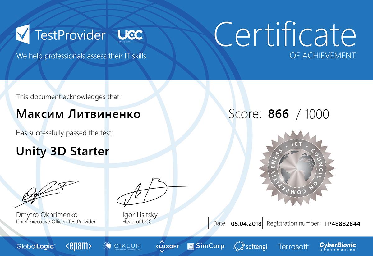 Курс Unity 3D Starter, на порталі ITVDN.com Сертифікат: https://testprovider.com/ru/certificate/TP48882644