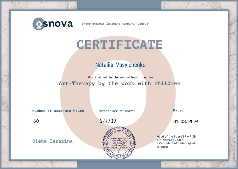 4. Дитячий арттерапевт, Диплом Міжнародної Федерації Арт-терапії, 2024р.